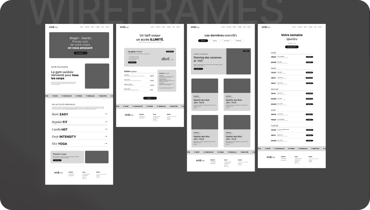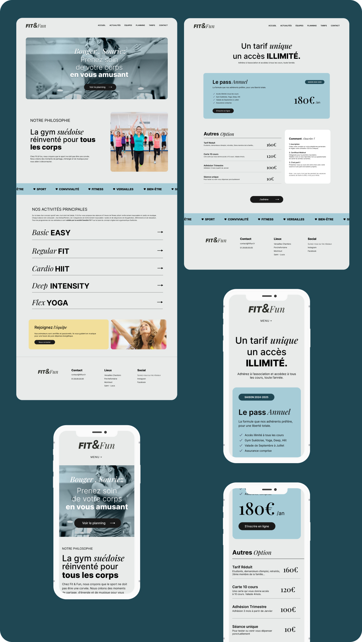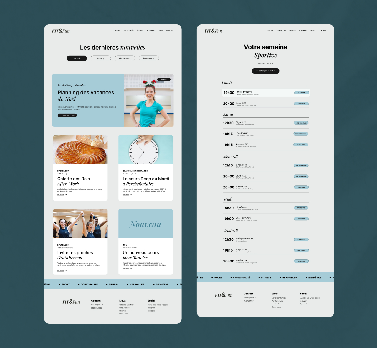 Fun&Fit est une association proposant des cours de gym suédoise. Le projet a consisté en une refonte UX/UI complète du site internet, qui présentait une architecture de l’information peu claire et une interface devenue obsolète. Il y a eu une réflexion sur les parcours utilisateurs afin de simplifier l’accès aux informations essentielles puis l’interface a ensuite été repensée avec une nouvelle direction visuelle : une palette de couleurs plus douce, des typographies modernes et une hiérarchie claire des contenus, dans le but d’améliorer la lisibilité, la cohérence globale et le confort de navigation. L’ensemble vise à offrir une expérience plus fluide, accessible et en adéquation avec l’univers bien-être et sportif de l’association.