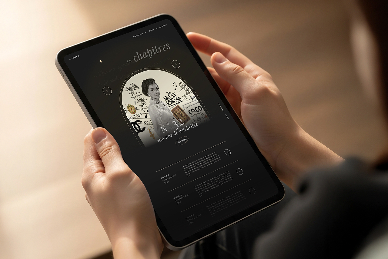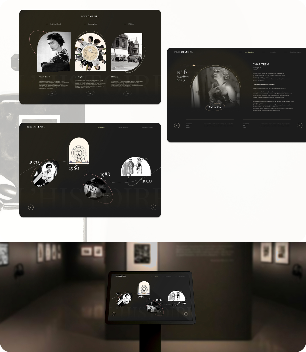 Il existe deux modes de navigation entre tablettes et bornes, des vues en grille, une timeline interactive et des pages de chapitres détaillées avec visuels et vidéos immersifs. L'identité visuelle sophistiquée crée une atmosphère luxueuse en parfaite cohérence avec l'univers de la maison Chanel.