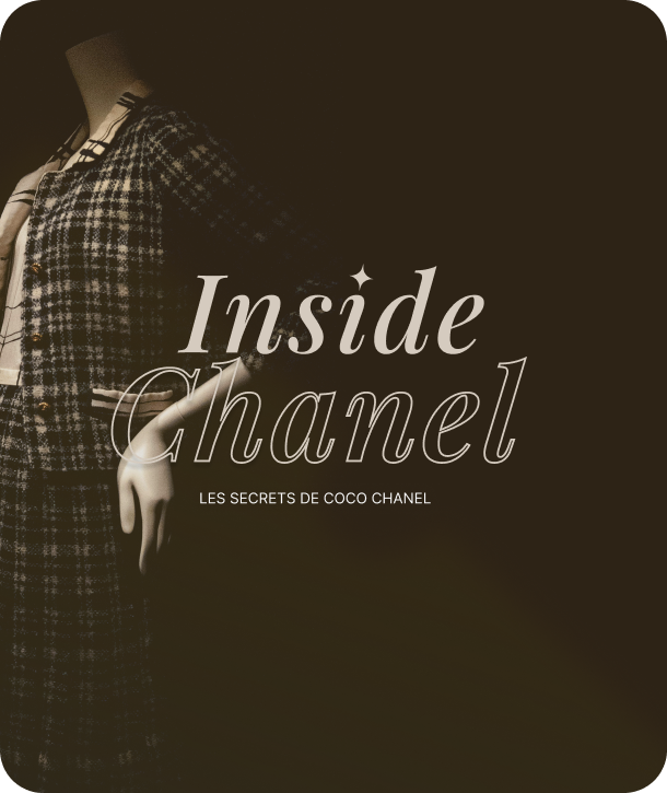 L'application permet aux visiteurs d'explorer la vie de Coco Chanel à travers une navigation chronologique élégante sur fond noir et or, mêlant photographies d'archives, vidéos par mini épisodes, dates clés et contenus narratifs.