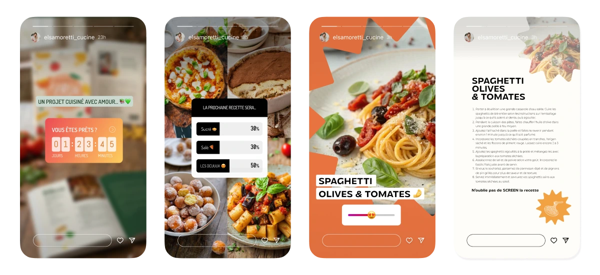 En parallèle, j'ai opéré une refonte de sa présence Instagram à travers des templates cohérents qui reprennent cette même identité visuelle : posts de recettes, stories interactives (sondages, comptes à rebours) et visuels d'annonce. L'objectif était de créer une synergie entre le livre et les réseaux sociaux, permettant à Elsa de communiquer de manière unifiée sur tous ses supports.