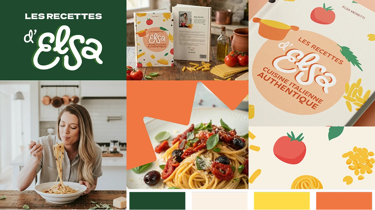 Mon rôle a été d'accompagner Elsa dans la structuration de son identité visuelle pour assurer une cohérence entre son univers digital existant et son nouveau projet éditorial. J'ai créé une ligne éditoriale complète pour le livre, établissant les fondations graphiques qui porteraient son message : une palette méditerranéenne vibrante (rouge tomate, vert basilic, jaune citron et orange sicilienne) évoquant les marchés italiens et la fraîcheur des ingrédients.