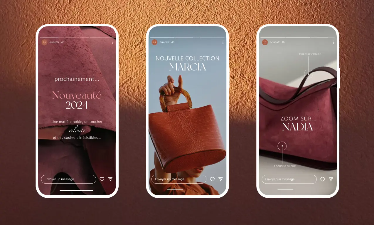 La marque propose principalement des sacs en cuir véritable, inspirés de l’Orient et importés de pays orientaux. Son identité graphique s’appuie sur des couleurs chaudes et un logo mêlant influences orientales et occidentales, à travers une typographie serif élégante et des courbes évoquant la souplesse du tissu et l’architecture orientale. Des templates de stories ont été créés pour illustrer quelques communication de la marque, tandis que le site internet adopte, lui, une approche sobre et épurée, pensée pour un public sensible au haut de gamme.